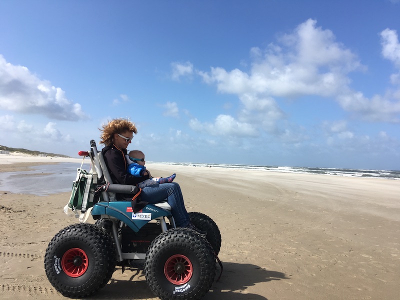De dag erna was de wind wat milder en wij beter voorbereid. We hadden een electrische strandrolstoel gehuurd. Een joekel van een apparaat met enorme banden en een joystick waarmee je voor- en achteruit en opzij kunt. Ook had hij een claxon, gordels en een stepje met gesp voor de voeten. Ik ging zitten met kind op schoot en partner liep naast ons. Dat ging goed: wij kwamen alledrie aan bij de branding!